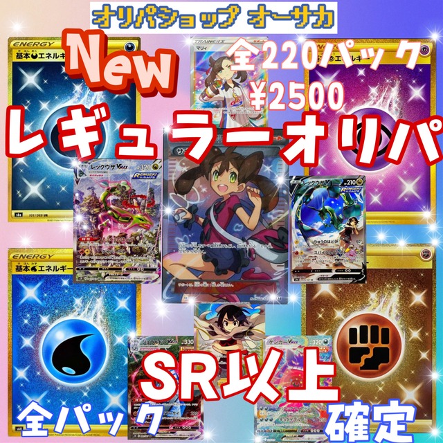 【ポケカオリパ 常設】Newレギュラー オリパ レギュラーオリパ好評につき 売り切れました(^^)ありがとうございます! ほんの少し当たり枠を増やして Newレギュラーオリパ登場!! 全220パック 1パック3枚入り 2,500円 ★〜★〜★〜★〜★〜★〜★〜★〜★〜★〜★ 【大当たり】1口 サナ【XY】SR 【当たり】1口 マリィ【シャイニースターV】SR 【中当たり】15口 レート 5000円~ 【小当たり】33口 レート3500円~ 【はずれ】170口(レート:計500〜2,000円) ★〜★〜★〜★〜★〜★〜★〜★〜★〜★〜★ 商品開封後、BASEやツイッターで評価いただけると、 今後の励みになりますのでよろしくお願い致します^^ 【特記事項】 ・封入レートは大手ネットショップの販売価格を参照しております。 ・商品状態はなるべく状態の良いもので揃えておりますが、細かいキズ等がある可能性がございますのでご理解ください。 ・返品・交換・キャンセル(入金後の)等一切出来兼ねますのでご了承下さい。 ・送料は一律400円とさせていただきます。 ・チャージバック対策として¥30,000以上の購入者様には発送前に購入意思の確認をしています。 ・オリパの内容によって評価を判断される方のご購入はご遠慮ください。 ・商品の発送はご入金後、2日~7日以内に行います。
